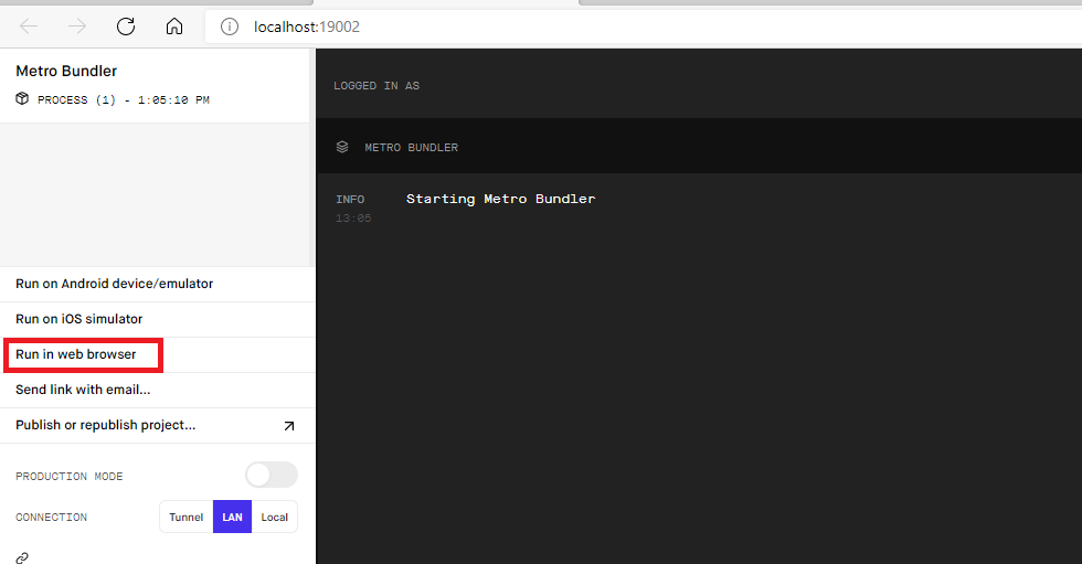 위 명령어를 실행하면 웹 브라우저에서 Expo 개발자 도구페이지가 열립니다.