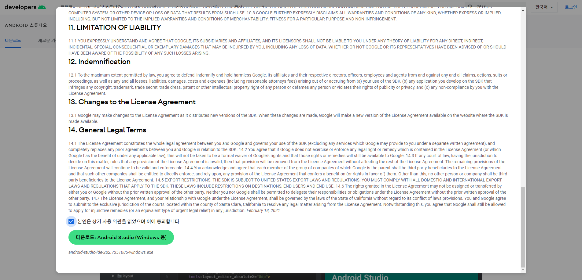 동의하기 체크박스 클릭 -> 다운로드 버튼 클릭합니다.