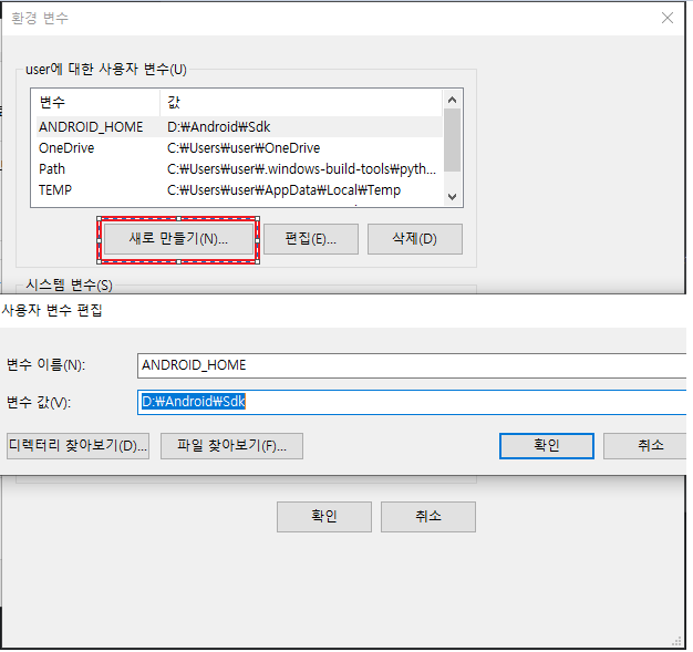 새로 만들기 sdk 폴더 밑에 platform-tools 경로까지 입력 후 확인 클릭