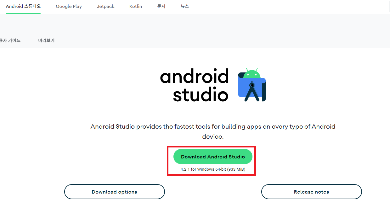 안드로이드 스튜디오 공식홈페이지 https://developer.android.com/studio?hl=ko 로 가서 다운로드합니다.