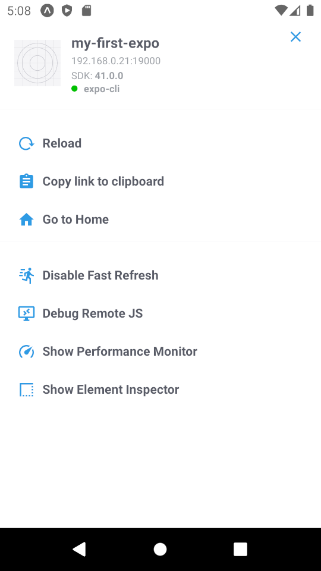 실제 기기에서 휴대폰을 흔들면 메뉴가 Expo 프로젝트 메뉴가 열립니다. 에뮬레이터로 진행하는 경우 IOS와 안드로이드 환경에서 각각 Command+Control+z와 Command +M 윈도우의 경우 Control+M을 이용해서 메뉴를 엽니다.