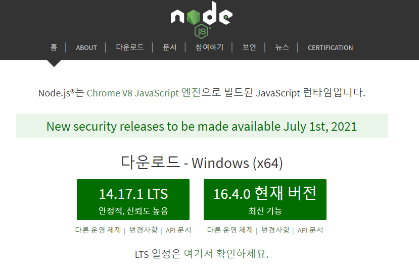 Node.js 공식홈페이지 https://nodejs.org/ko/ 로 가서 다운로드 버튼을 클릭합니다. (안정화된 LTS 버전을 추천합니다. )
