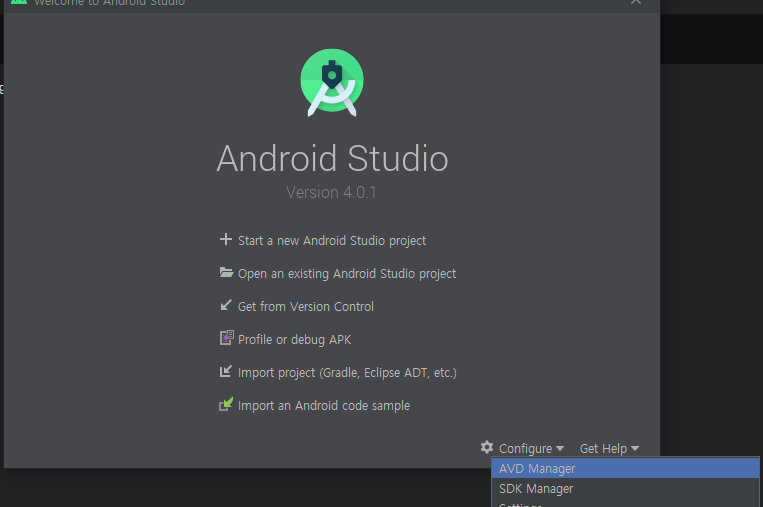 안드로이드 스튜디오 실행하고, configure -> SDK Manager 클릭