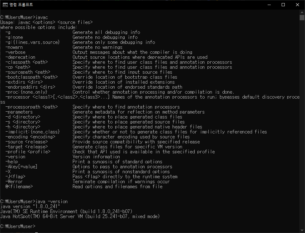명령 프롬프트 창을 실행하여 javac 와 java -version을 입력하여 다음과 같이 실행되는지 확인합니다.