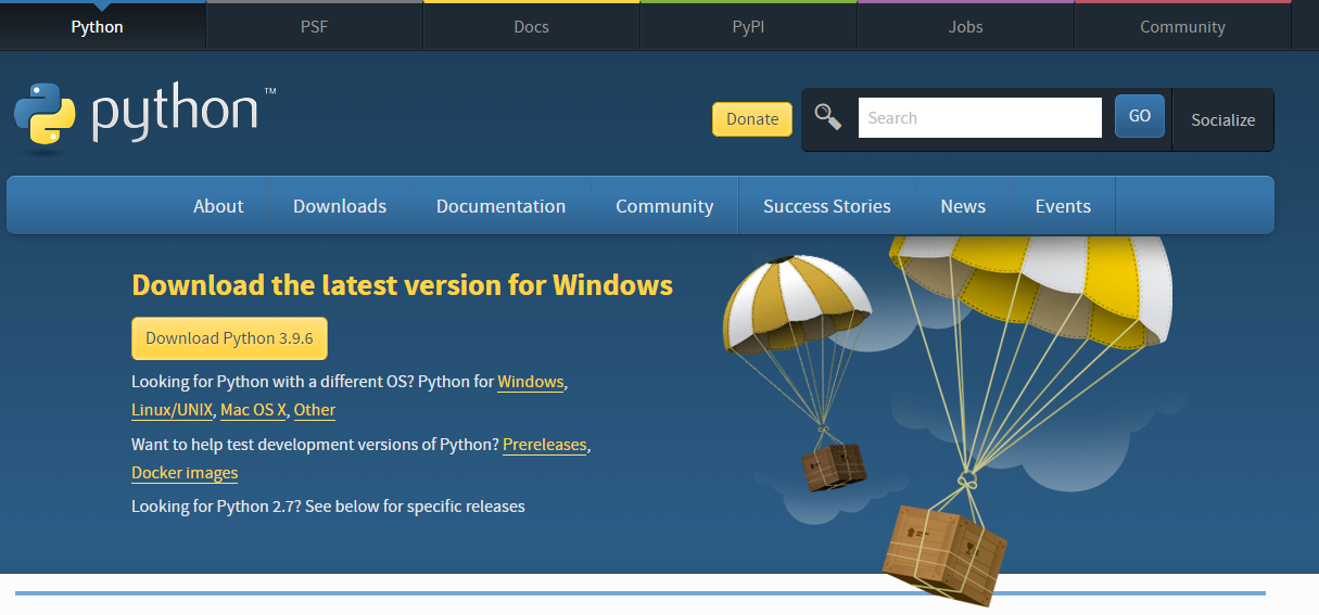 파이썬 공식 홈페이지의 다운로드 페이지(http://www.python.org/downloads)에서 다운로드 버튼을 클릭하여 설치합니다. Python 3.x로 시작하는 버전 중 가장 최근의 윈도우 인스톨러를 다운로드합니다.