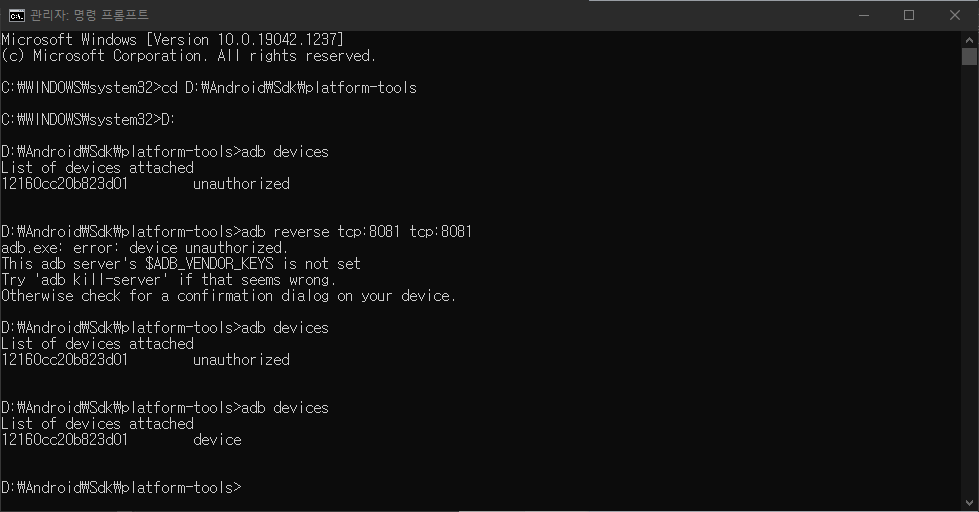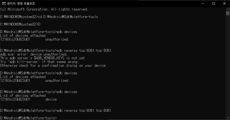 만약 unauthorized 명령어가 아래와 같이 뜬다면 휴대폰기기에서 개발자옵션 > USB디버깅을 비활성화했다가 다시 활성화하여 줍니다 그러면 권한 허용을 하라는 메시지들이 뜨는데, 모두 허용을 눌러줍니다.