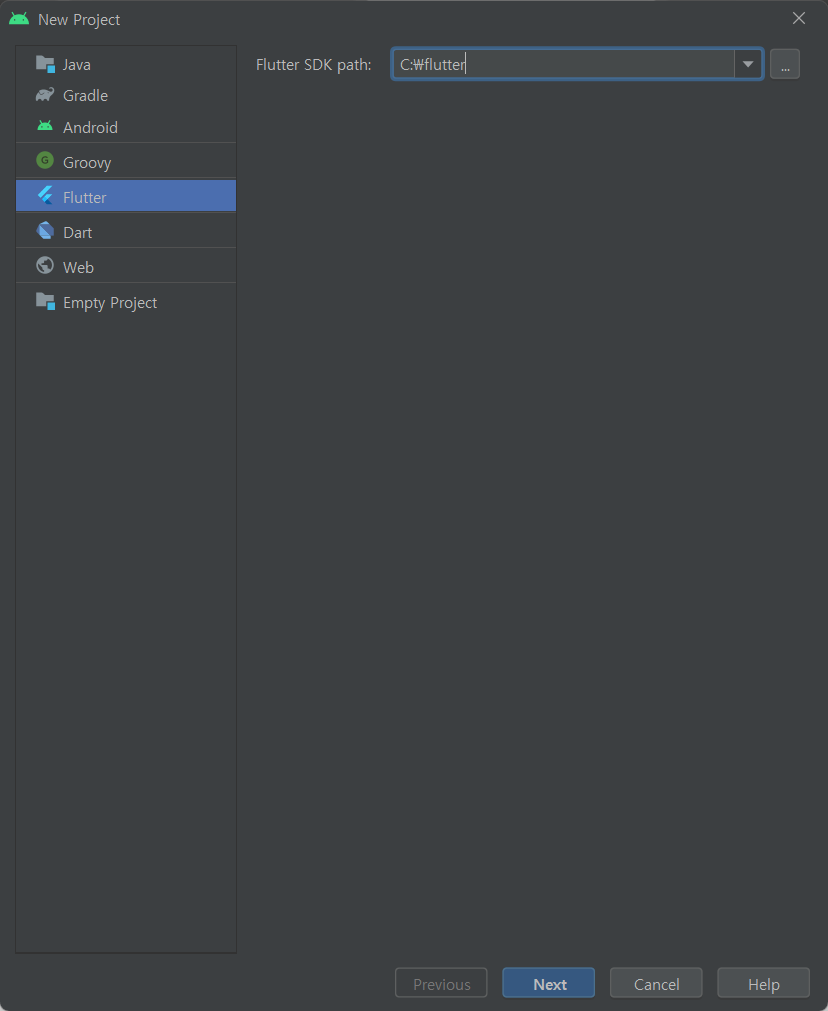 Flutter 선택 -> 이전 환경설정해둔 flutter sdk 정보를 선택 -> Next 버튼 클릭