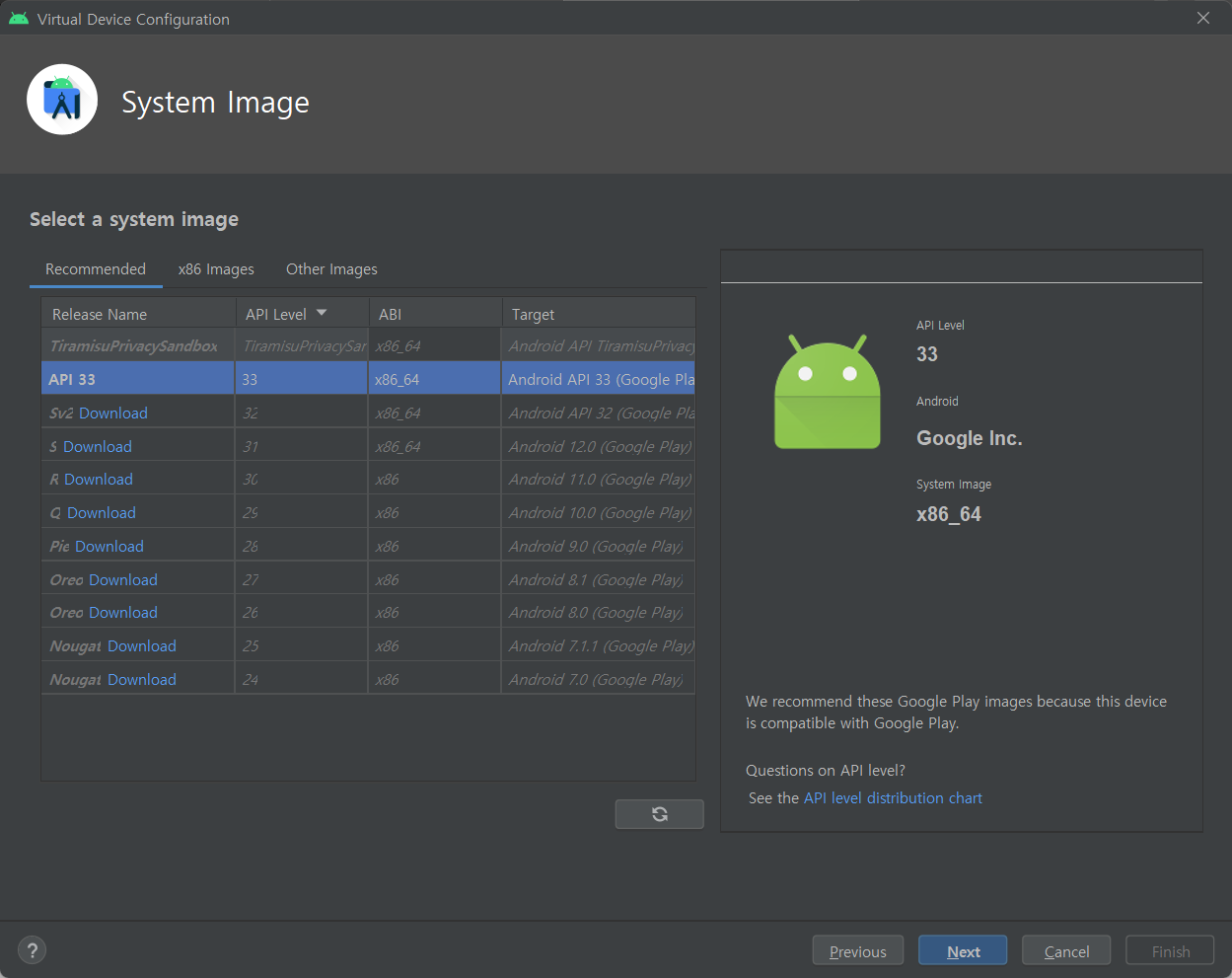 테스트 하고싶은 안드로이드 SDK 버전을 선택 한 후 Next