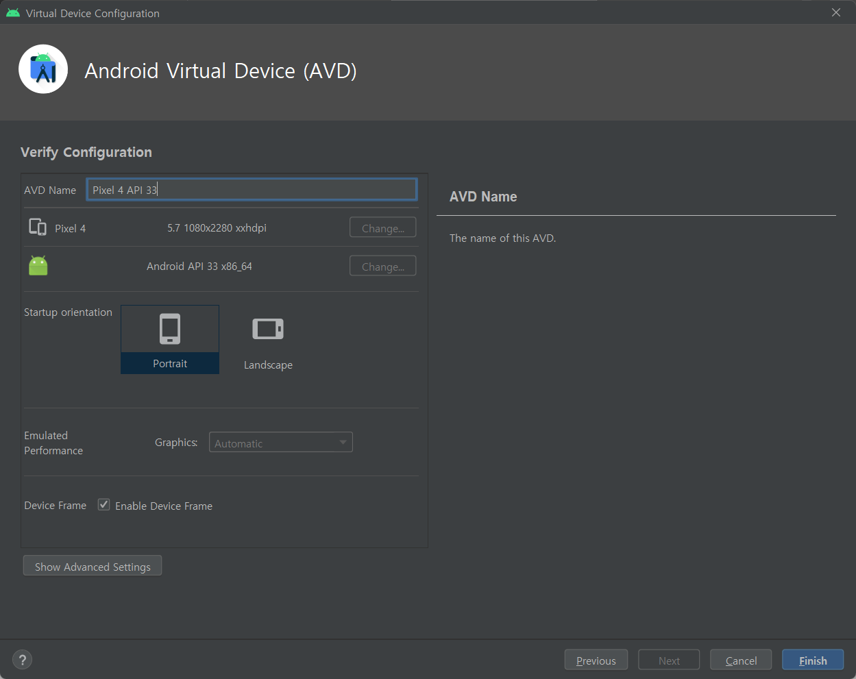 생성한 AVD 실행 버튼 ( ▶) 클릭
