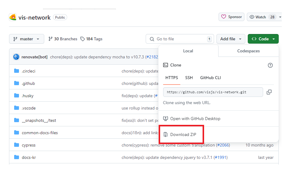 Download ZIP 폴더를 눌러 vis-network 파일을 다운로드합니다.