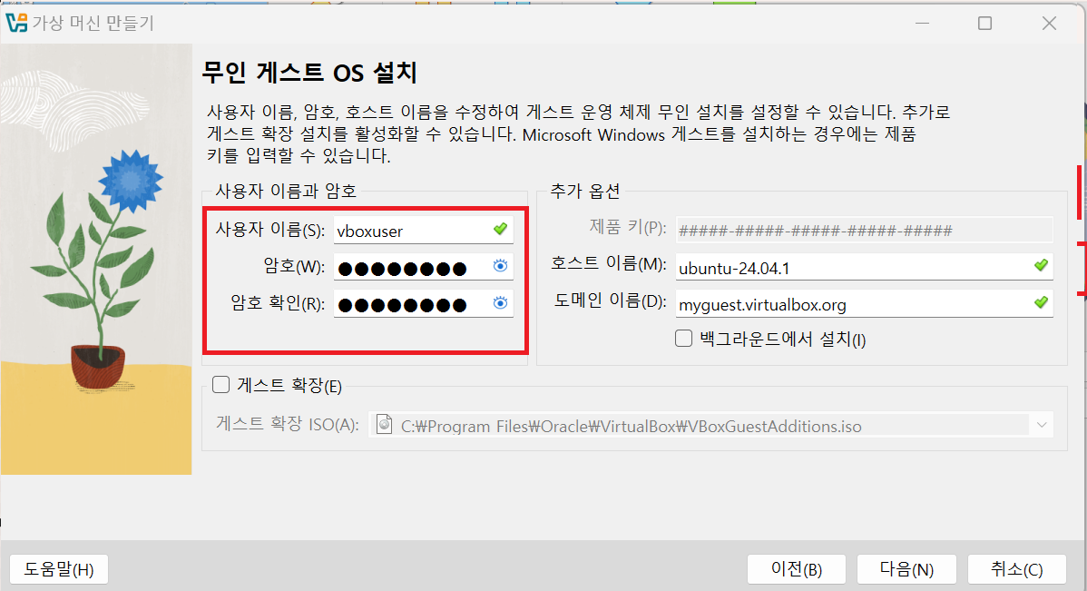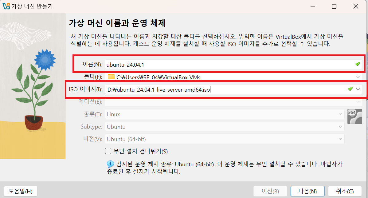 가상머신의 이름과 앞서 설치한 우분투 iso 파일을 선택한 후 다음 버튼을 클릭합니다.
