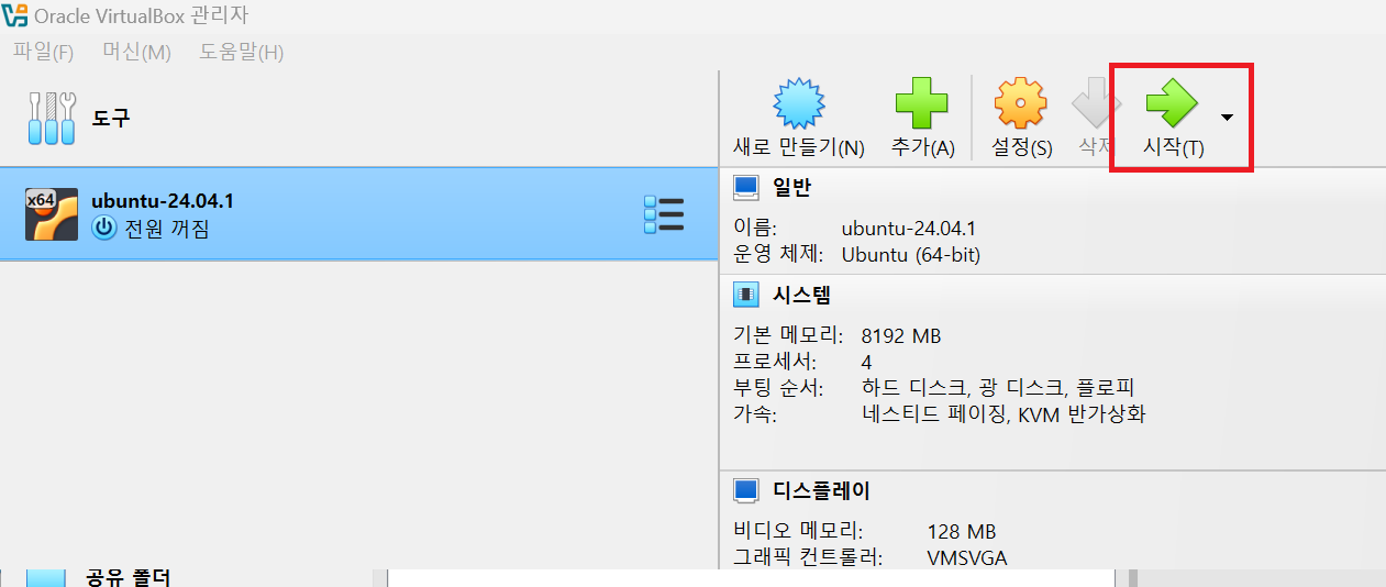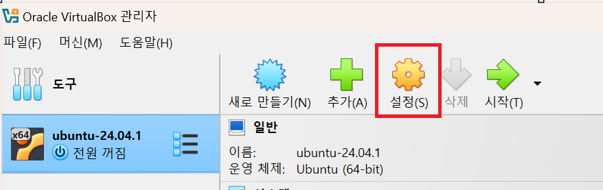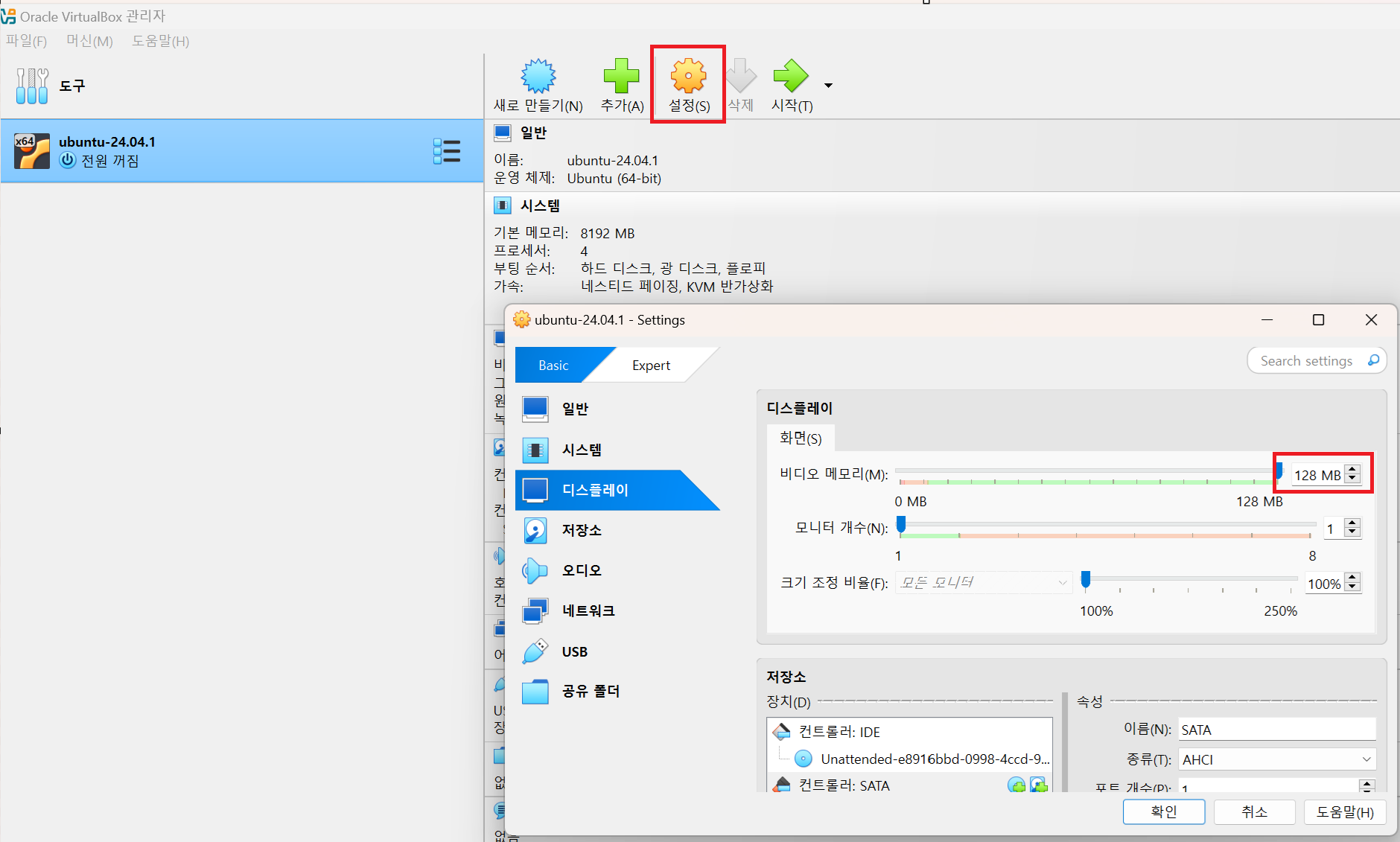 생성한 가상서버 클릭 -> 설정 버튼 클릭 -> 디스플레이 비디오 메모리 최대 값으로 설정