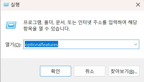 windows key+ r 클릭 optionalfeatures 입력