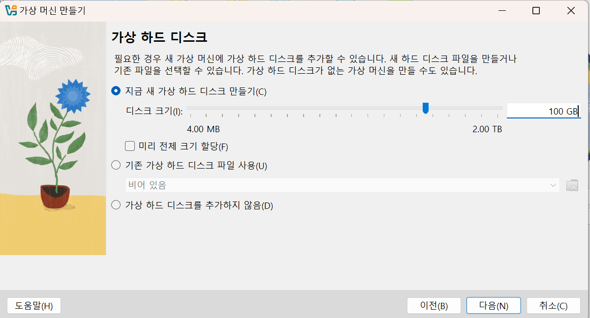 하드 디스크 크기 100GB 이상 권장