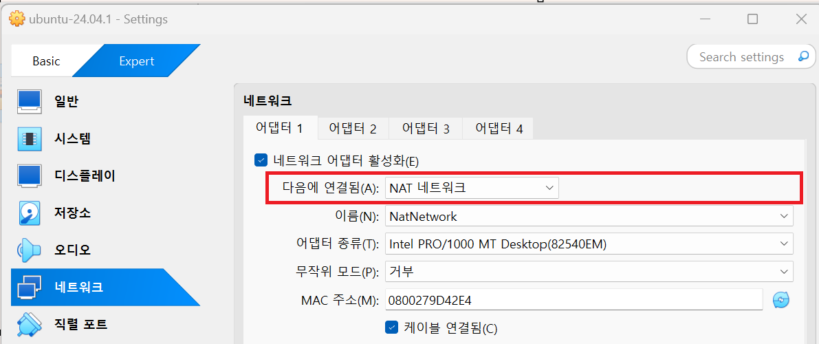 네트워크 > 어댑터1의 다음에 연결됨을 NAT 네트워크로 선택한 후 확인버튼 클릭