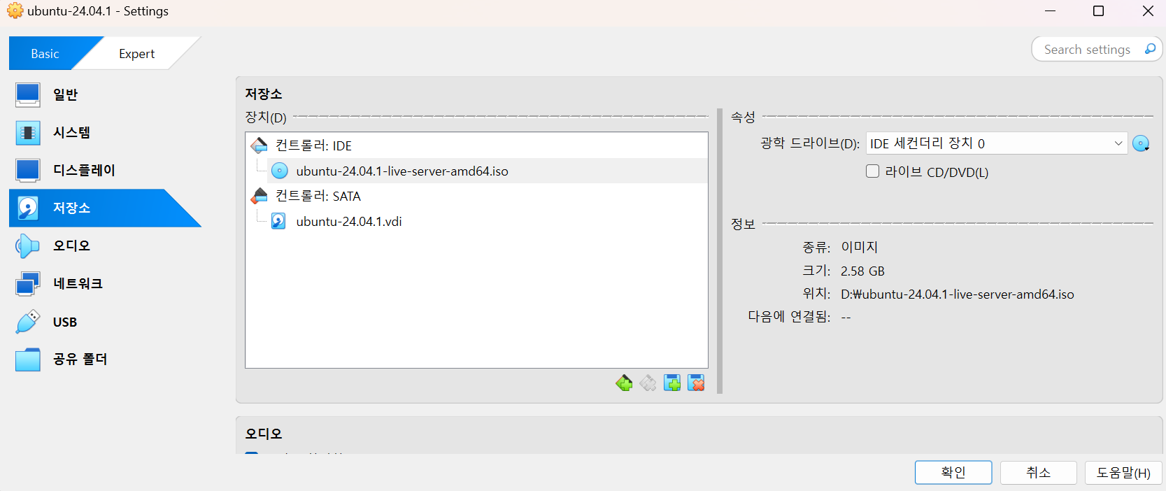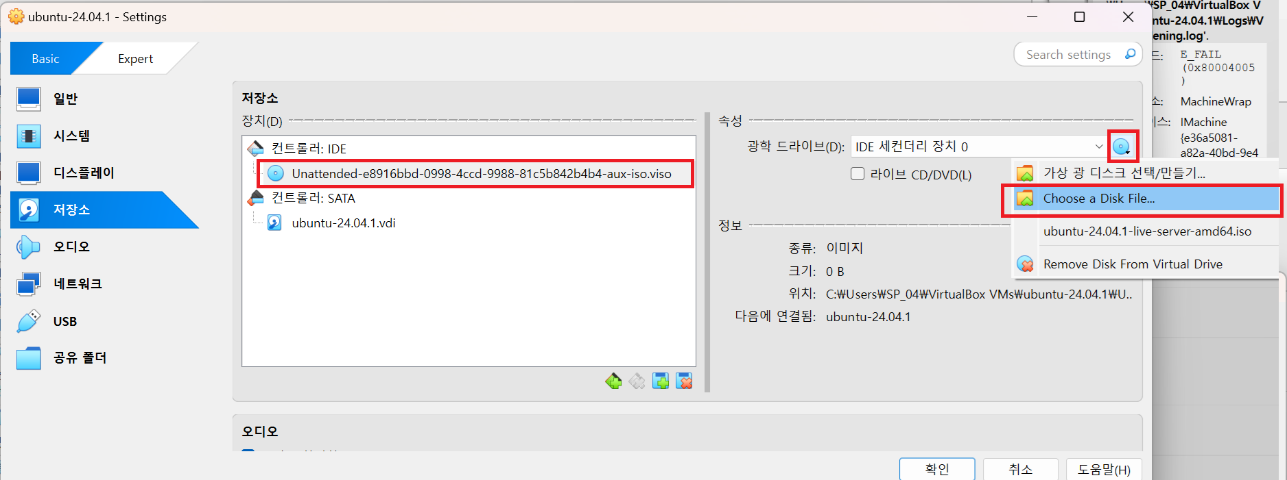 저장소 버튼 클릭 -> 컨트롤러 IDE 값이 제대로 들어갔는지 확인 비어있음 혹은 정상적으로 os 이미지가 없다면 IDE 클릭 -> 디스크아이콘 클릭 -> Choose a Disk File... 클릭 -> 설치한 우분투 iso 파일 선택