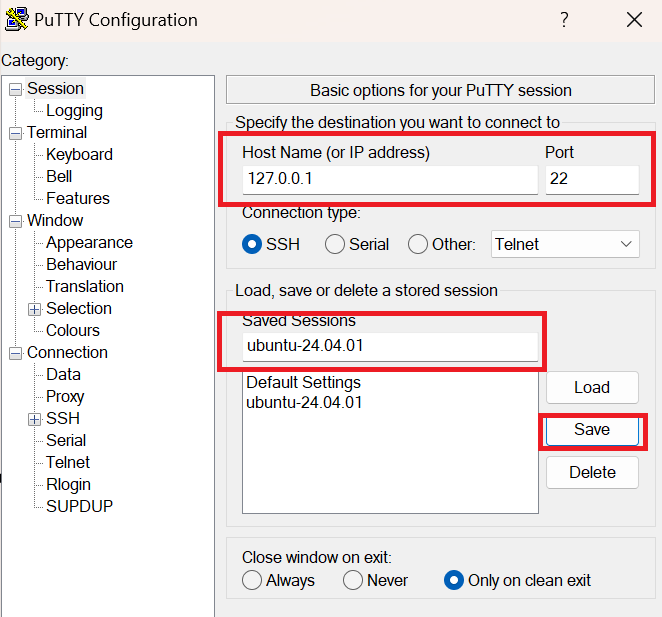putty 실행 후 Host Name , Port ,Saved Sessions에 원하는 서버명 입력 후 Save 버튼을 클릭합니다.