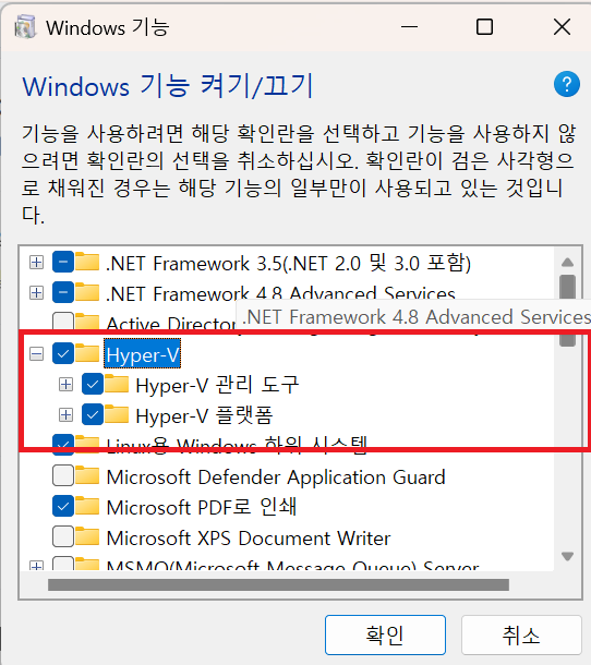 Hyper-V 체크 설정 -> PC 재부팅