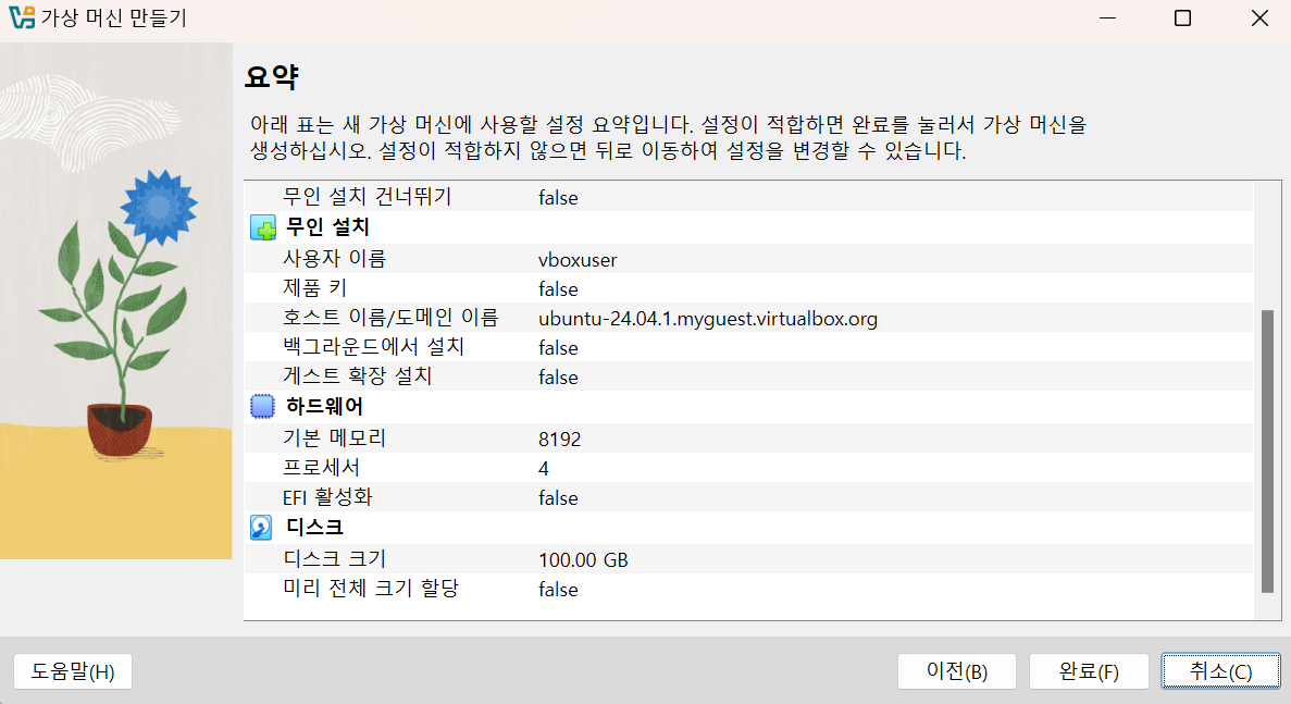 설정 값 확인 후 완료 버튼 클릭
