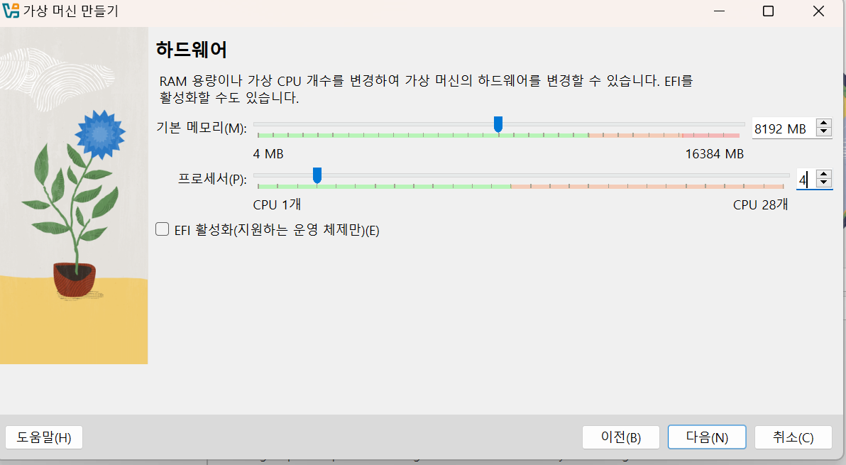메모리 값은 8192MB 이상 , CPU 4 이상으로 설정 권장