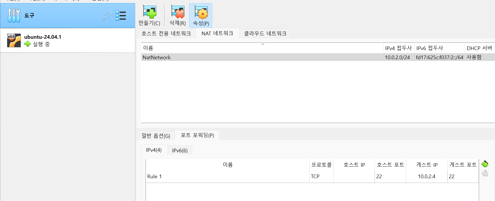 virtualBox 관리자의 도구 > 포트포워딩 탭 클릭 > 아래와 같이 입력 후 적용버튼 클릭
