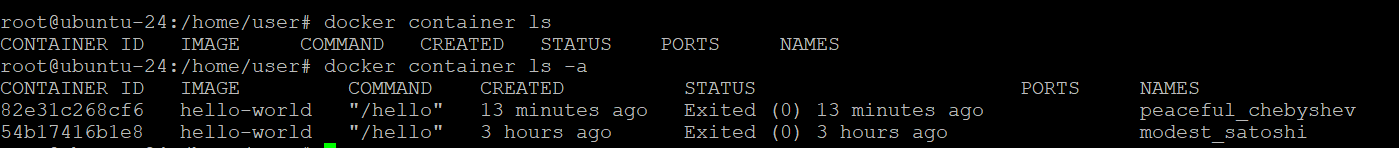 hello-world라는 컨테이너를 실행했지만 종료 상태인 이유는 컨테이너 내부 프로세스가 모두 종료되었기 때문에 종료상태로 처리됩니다.