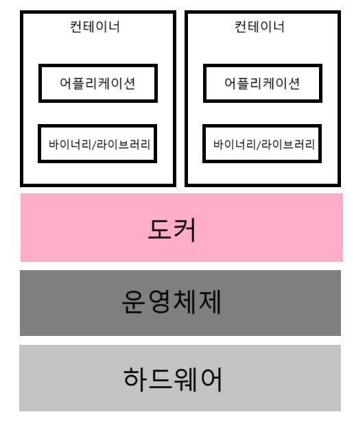 도커를 활용한 어플리케이션 실행은 위 그림과 같습니다. 운영체제 위에 도커가 설치되고 도커는 컨테이너 단위로 어플리케이션을 실행합니다. 컨테이너들은 서로 격리되어있으므로 독립성을 보장합니다. 각 컨테이너는 어플리케이션을 실행하는데 필요한 최소한의 바이너리, 라이브러리를 포함합니다.