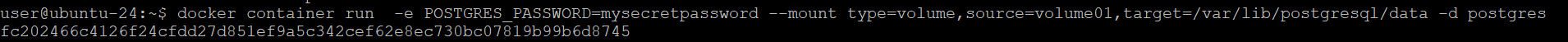 docker container run -e POSTGRES_PASSWORD=mysecretpassword --mount type=volume,source=volume01,target=/var/lib/postgresql/data -d postgres
