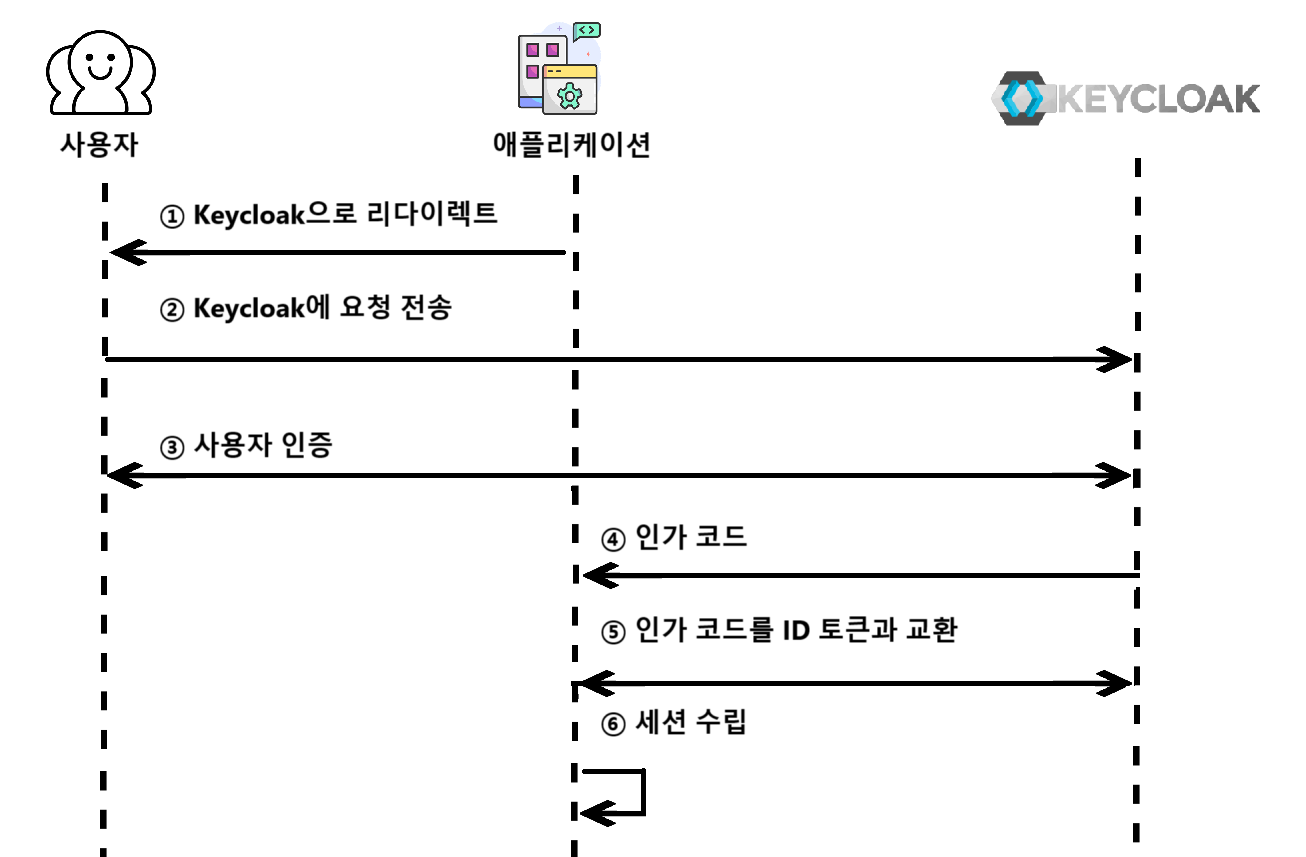⑤ 애플리케이션은 Keycloak의 토큰 엔드포인트에 대한 토큰 요청을 통해 인가 코드를 ID 토큰 및 접근 토큰으로 교환합니다.